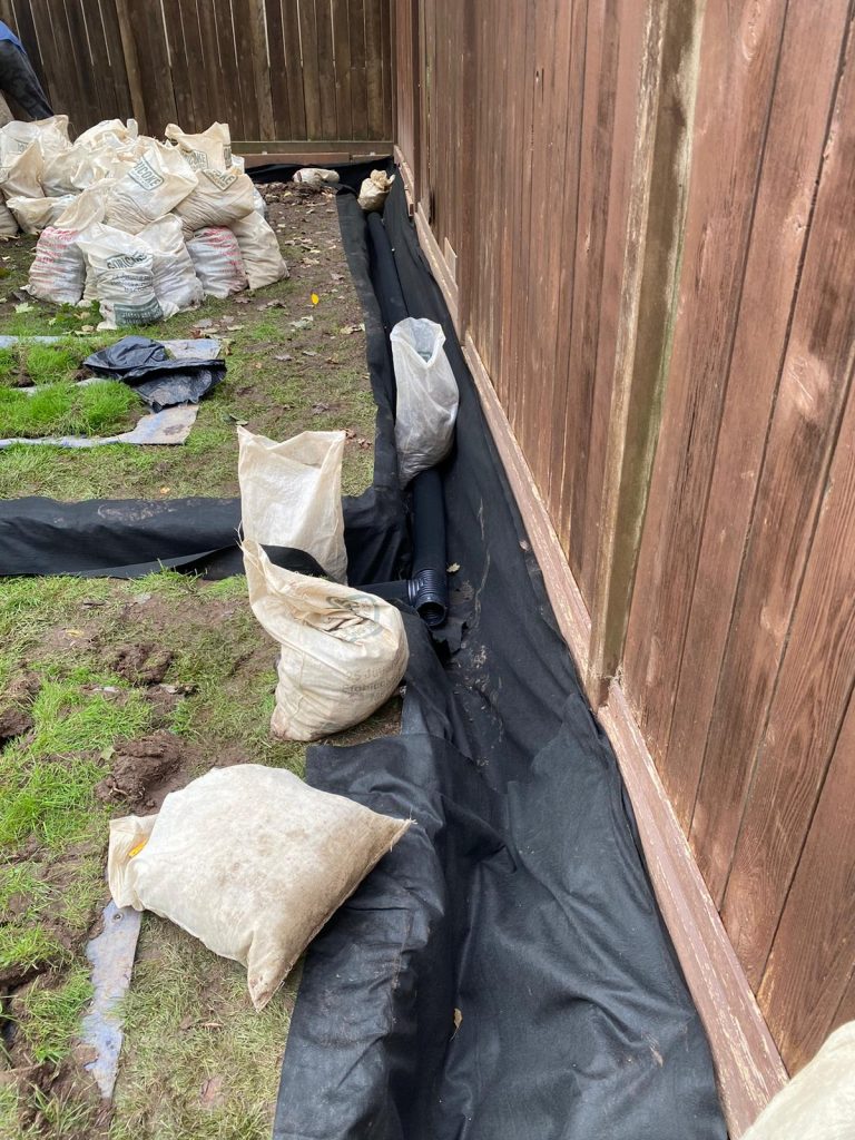 Approximately 60 linear feet of trench was excavated to install a new French drain system. A filter cloth was installed along the base of the trench, followed by the installation of perforated weeping tile with filter for the full length of the excavation. The drainage system was provided with a discharge point to the side of the property to allow proper water flow away from the home.
