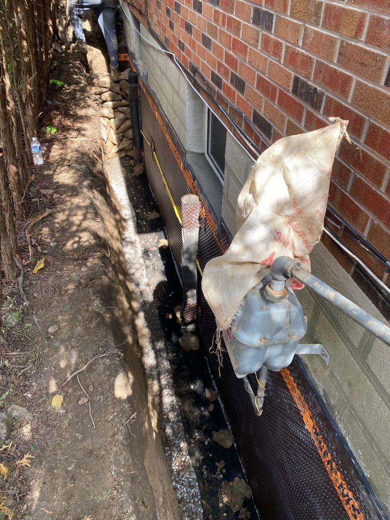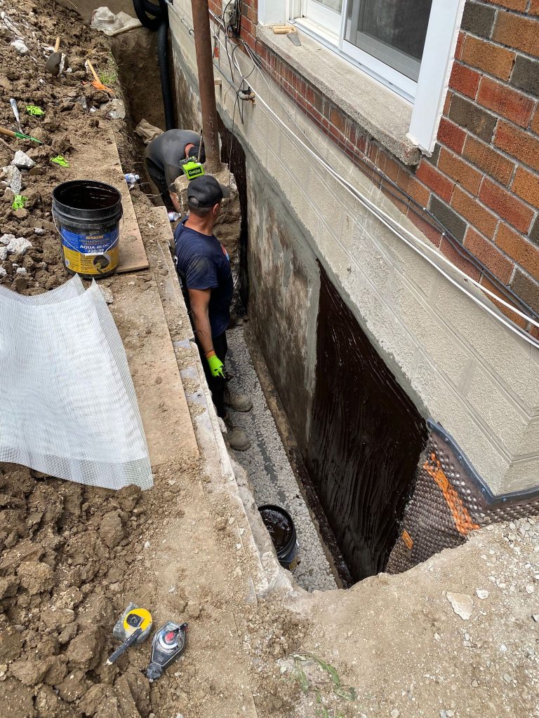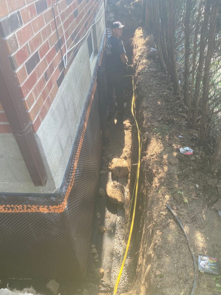 The affected foundation areas were excavated to expose the below‑grade walls. Once exposed, the foundation surfaces were thoroughly cleaned and inspected. All vulnerable areas were properly sealed, and a high‑quality exterior waterproofing membrane was applied to prevent groundwater penetration and hydrostatic pressure.